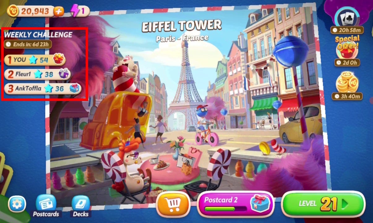 Weekly Challenge becomes available after level 5. It is a competition based social feature where players compete on a leaderboard to reach the top 3 before the week ends. It creates a mid-term engagement from the very early stage of the game. Players collect stars by completing levels, and those who successfully fill the streak meter are rewarded with additional stars, that provides a competitive advantage. Top 3 players are rewarded with various prizes, including coins, boosters, deck parts, and card packs.