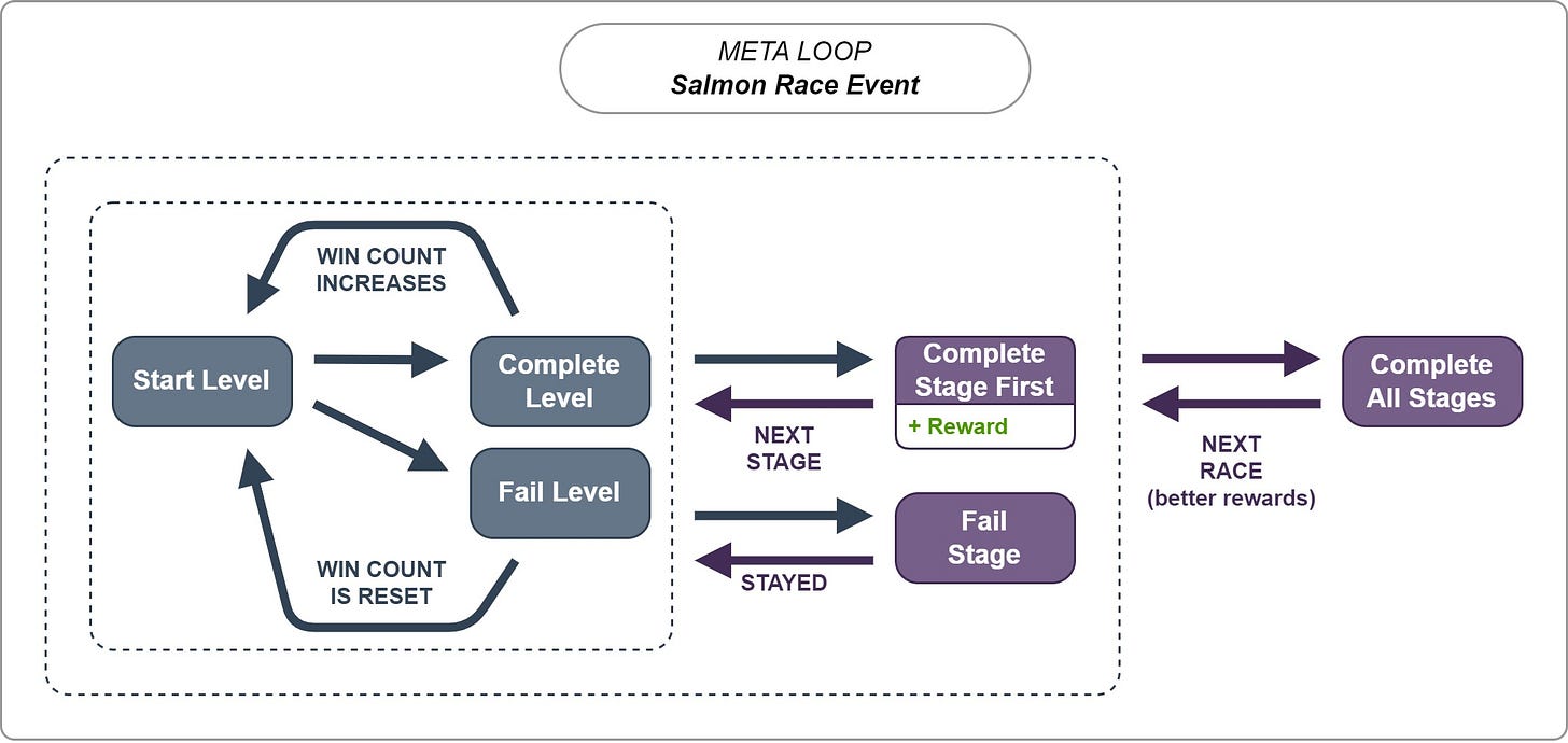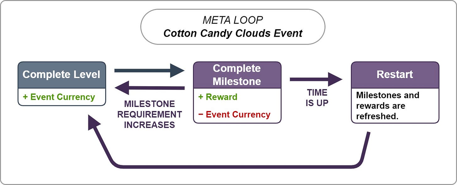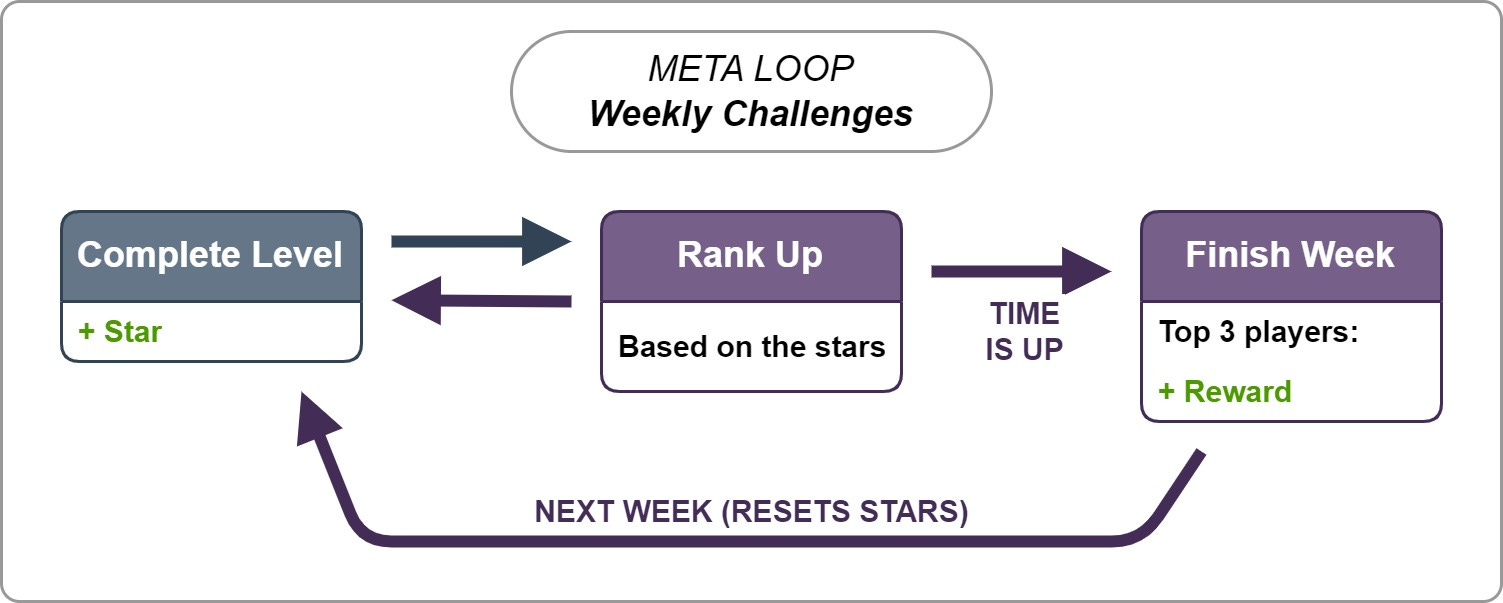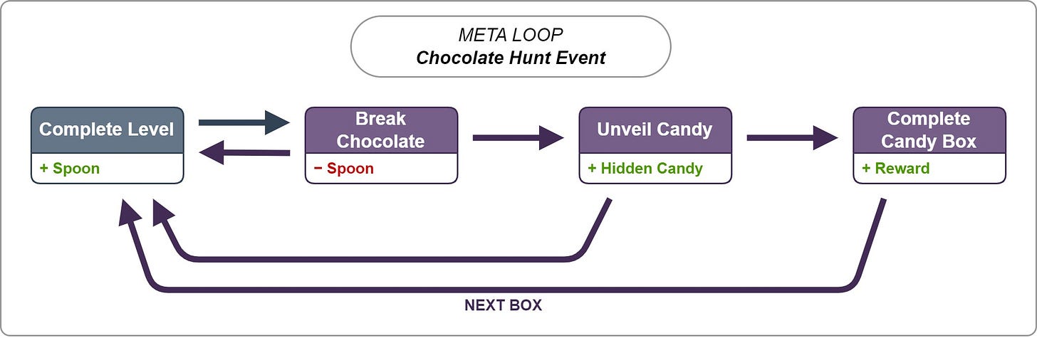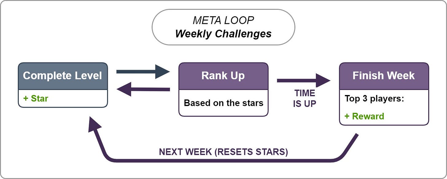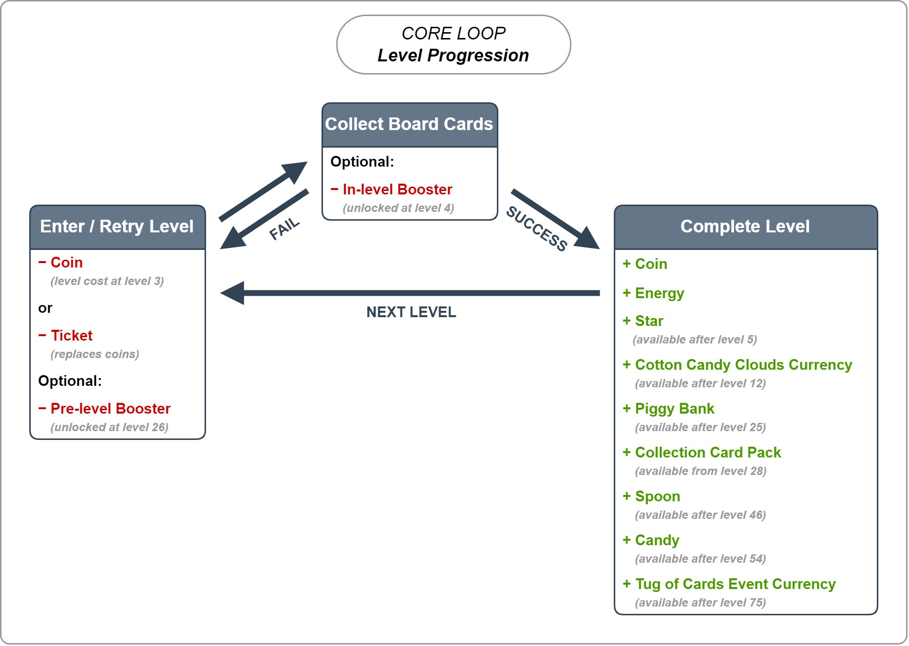 I always like to define the core loops as a nonremovable / unchangeable loop of the game, so that we can identify the fundamental structure that engages players. In this scenario, level progression is defined as the core loop that also feeds meta layers of the game, as in the core loop diagram.