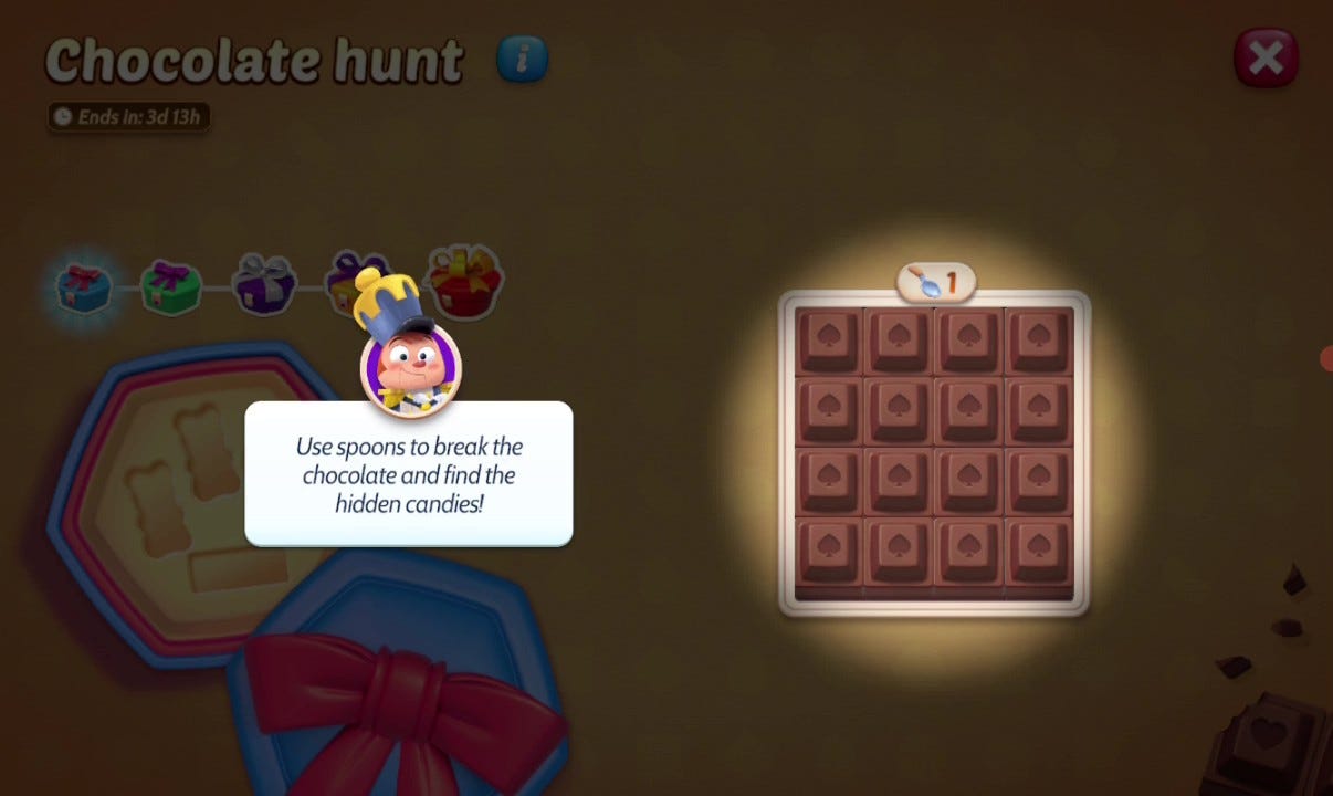 Chocolate Hunt is a time-limited event that becomes available after level 46. Each successful level completion rewards the player with spoons, which are used to break the chocolate and reveal candies. When the candy box is ready, a reward is given, and the next box becomes available with a larger chocolate bar. Each stage requires more spoons to complete.