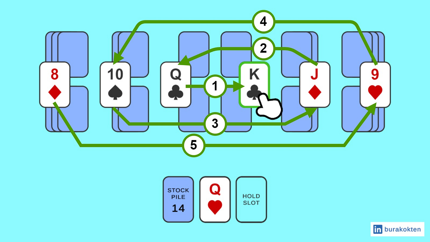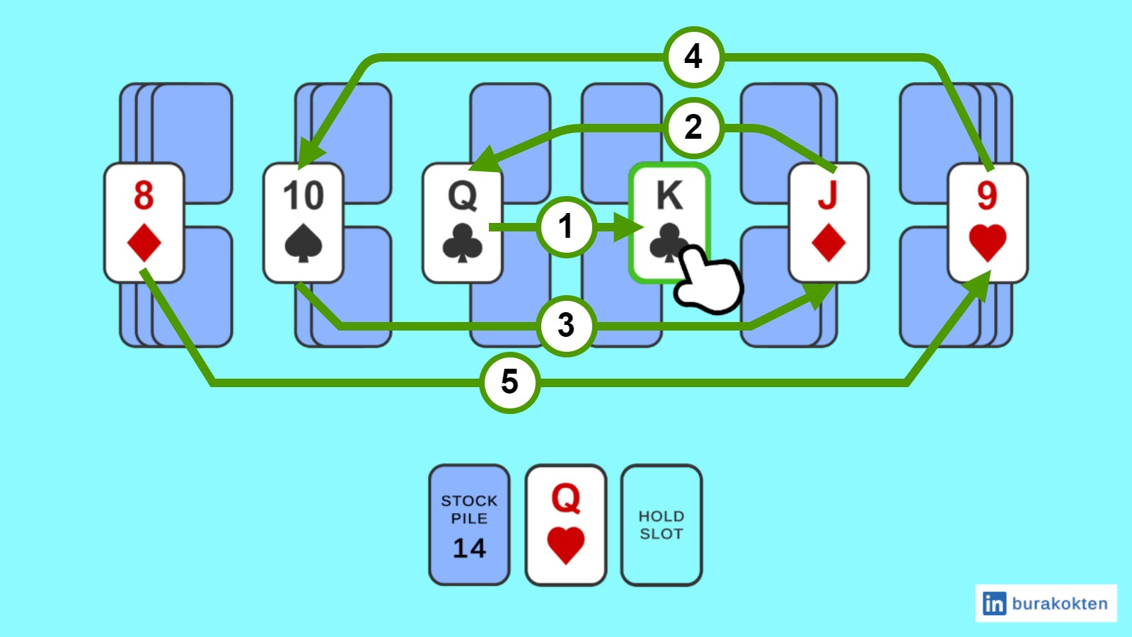 As seen in the image above, collecting “K, Q, J, 10, 9, 8” respectively is the best solution we can achieve. We can say that number of consecutive matches is 5 for this example, because we are able to collect 5 more cards after collecting the “K”.