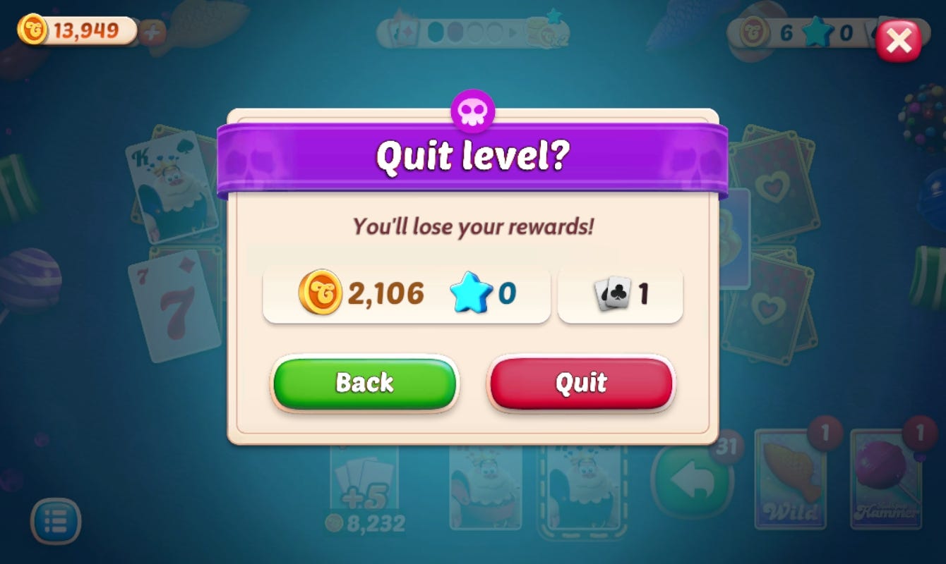 When a player wants to quit the game without completing a level, a loss aversion popup appears, showing the rewards the player will lose, something commonly seen in many other games, regardless of the genre.