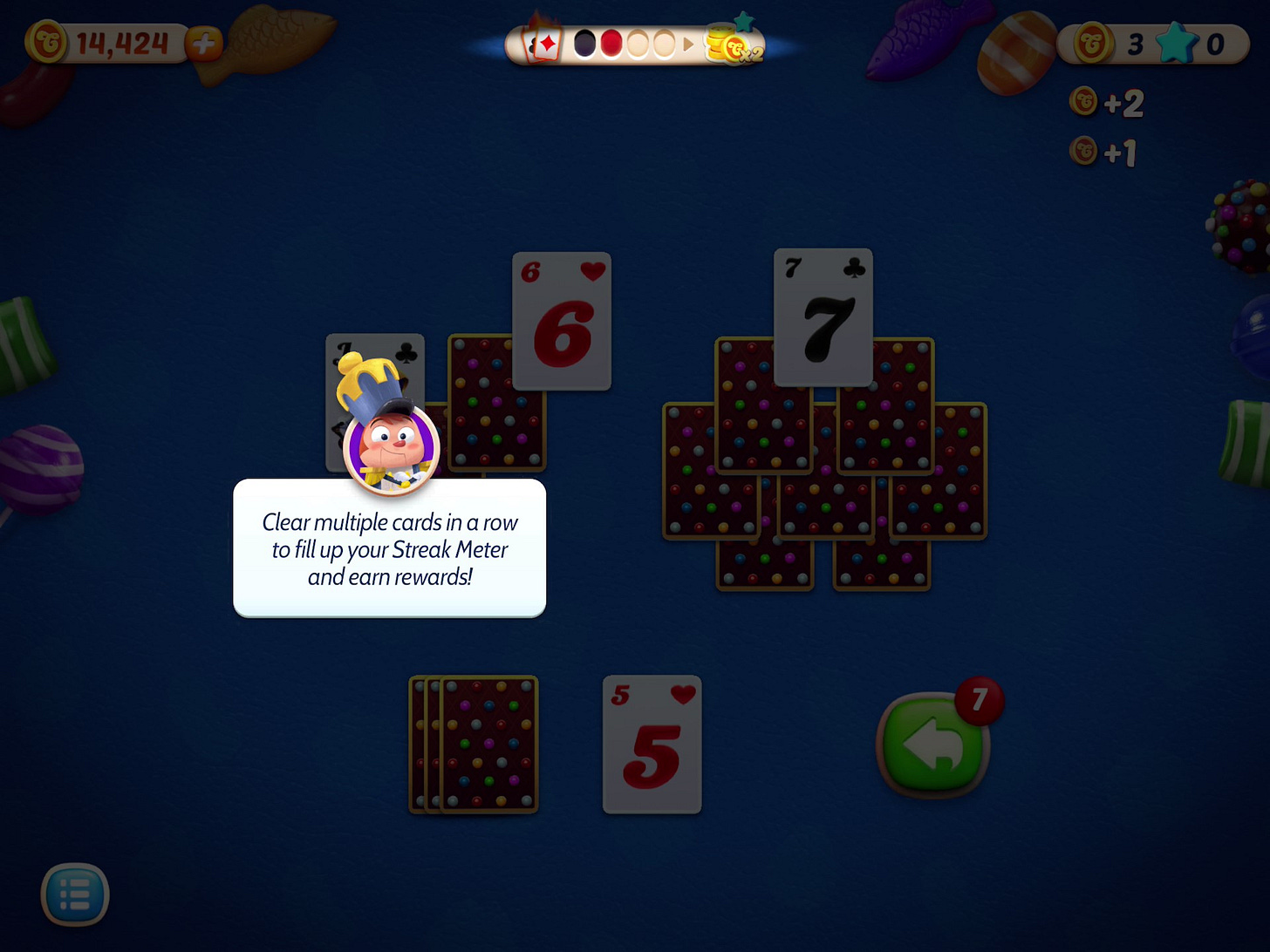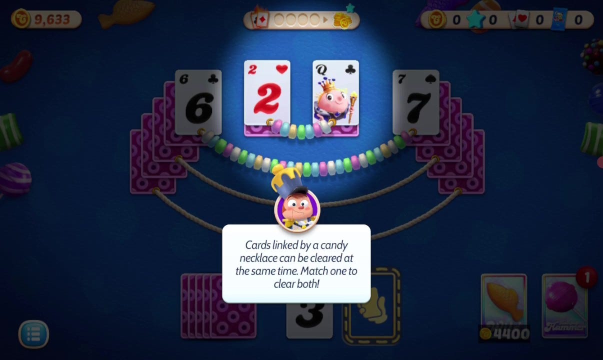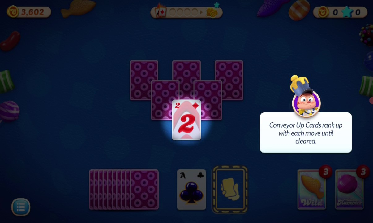 Candy Crush Solitaire has a smooth FTUE, supported by a classic approach with bubble tutorials that teach players how to match cards, assuming they've never played tripeaks solitaire before. Obstacles are not introduced until level 22, unlike match3 games like Royal Match, which introduce them from the first level.