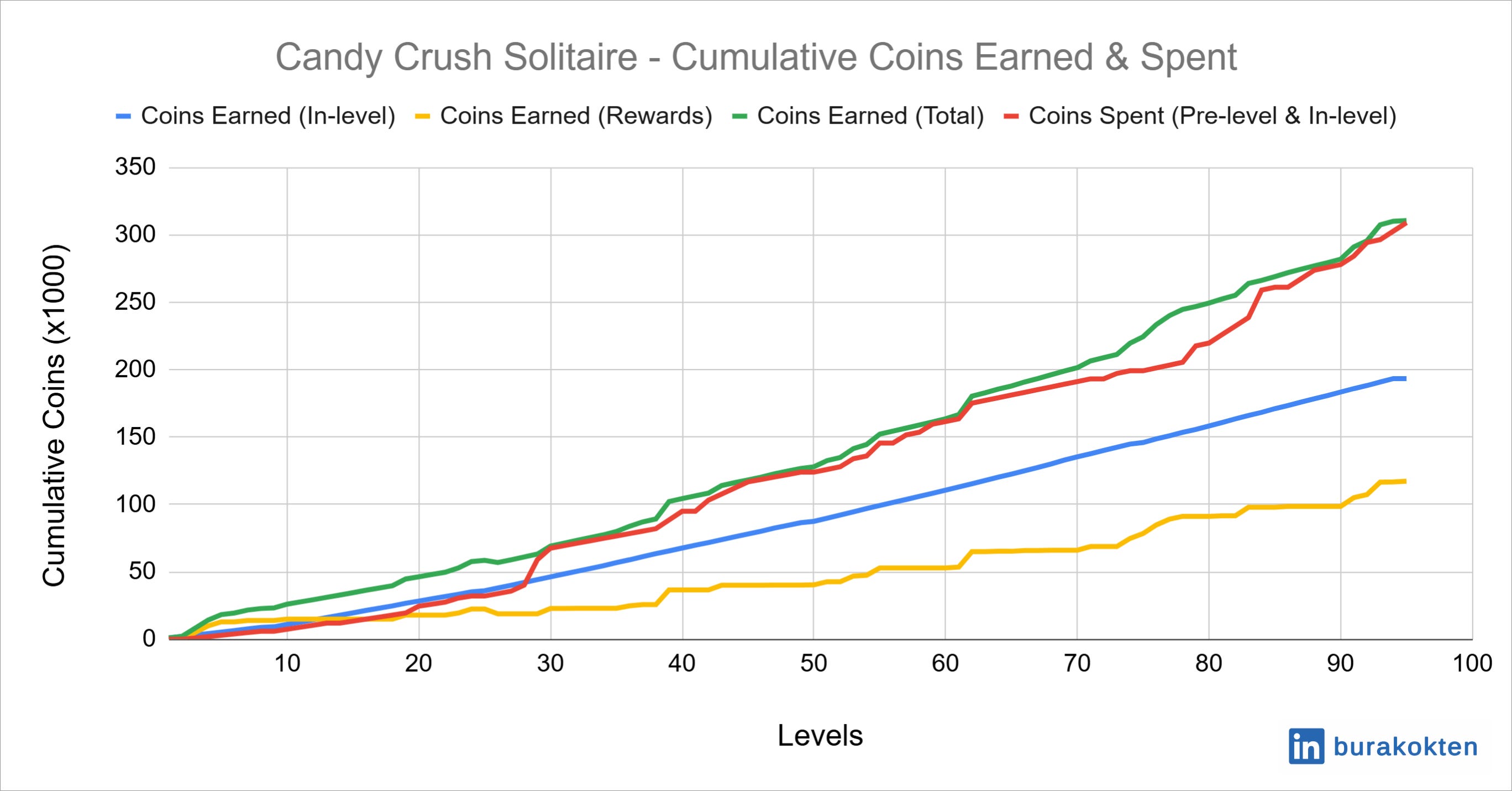 As seen in the above chart, the total coins earned across levels are always higher than the total coins spent. It is obvious that coins obtained from level completions are not sufficient to progress without coin rewards coming from meta layers. However, I can say that there are no paywalls in the first 95 levels, and IAPs are not mandatory to progress. Keep in mind that although I failed the first time at level 95 it was not because I didn’t have any boosters. The reason was that I was avoiding using pre-level boosters (which I had 25 of them) to measure the level difficulties, and I didn't have enough coins to use any in-level boosters.