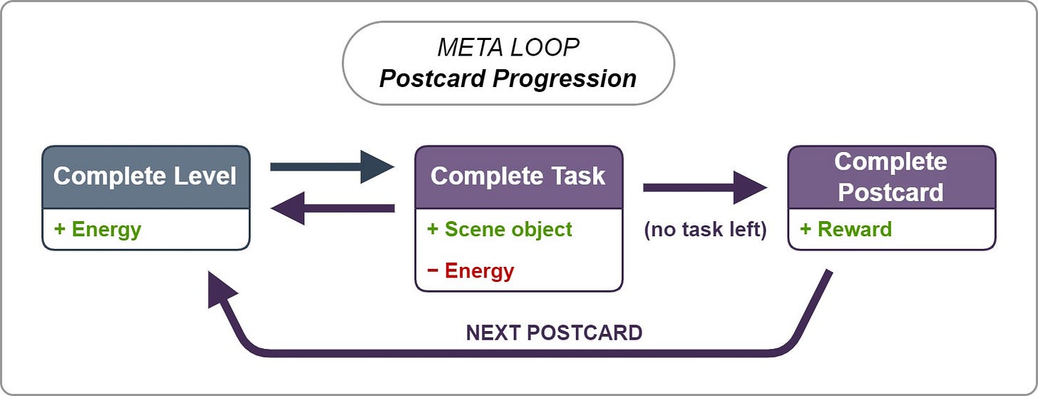 Postcard progression is the first meta loop introduced to players. Although the fast progression on the first postcards creates short-term engagement, it mainly aims for long-term engagement. Completing levels awards players with energy, which is used to decorate the postcard with new scene objects. When a postcard is completed, next one becomes available.