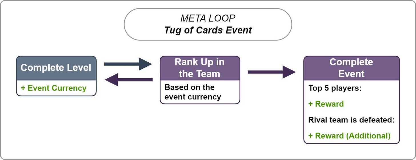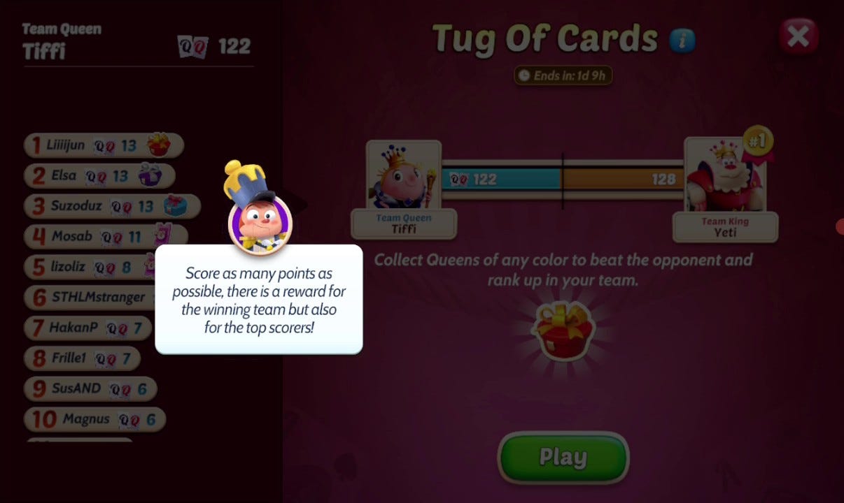 Tug of Cards is an optional, time-limited, competitive event introduced after level 75. There are 2 teams, each consisting of 20 players, competing against each other to collect the card type (event currency) decided by the team leads in order to defeat the opponent. The team with the higher score at the end of the event wins and receives the grand prize. Additionally, players within the same team also compete against one another to rank up and earn more rewards, even if their team loses.