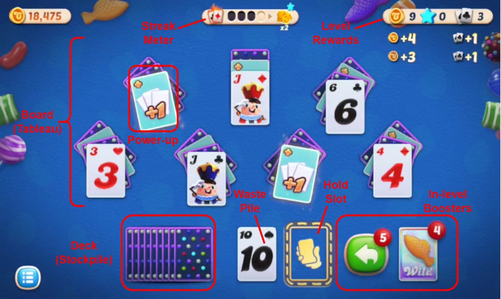 In level 11, the hold slot game mechanic is introduced, allowing players to set aside the top card of the waste pile when needed. In the best-case scenario, this mechanic doubles the chance of matching a waste pile card with a board card compared to the classic approach.