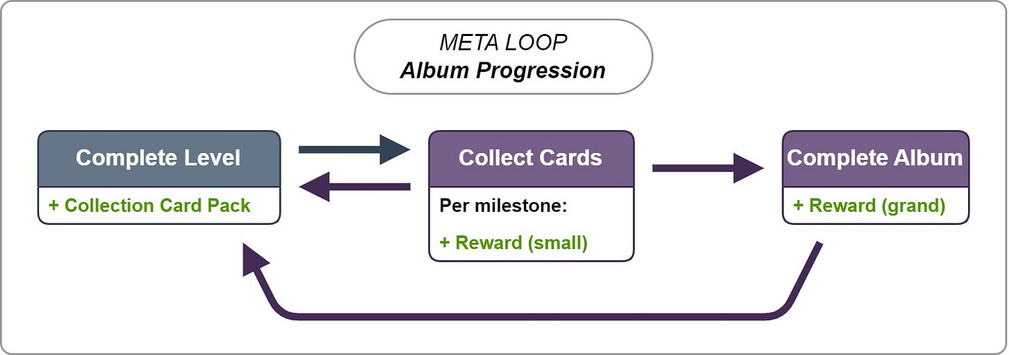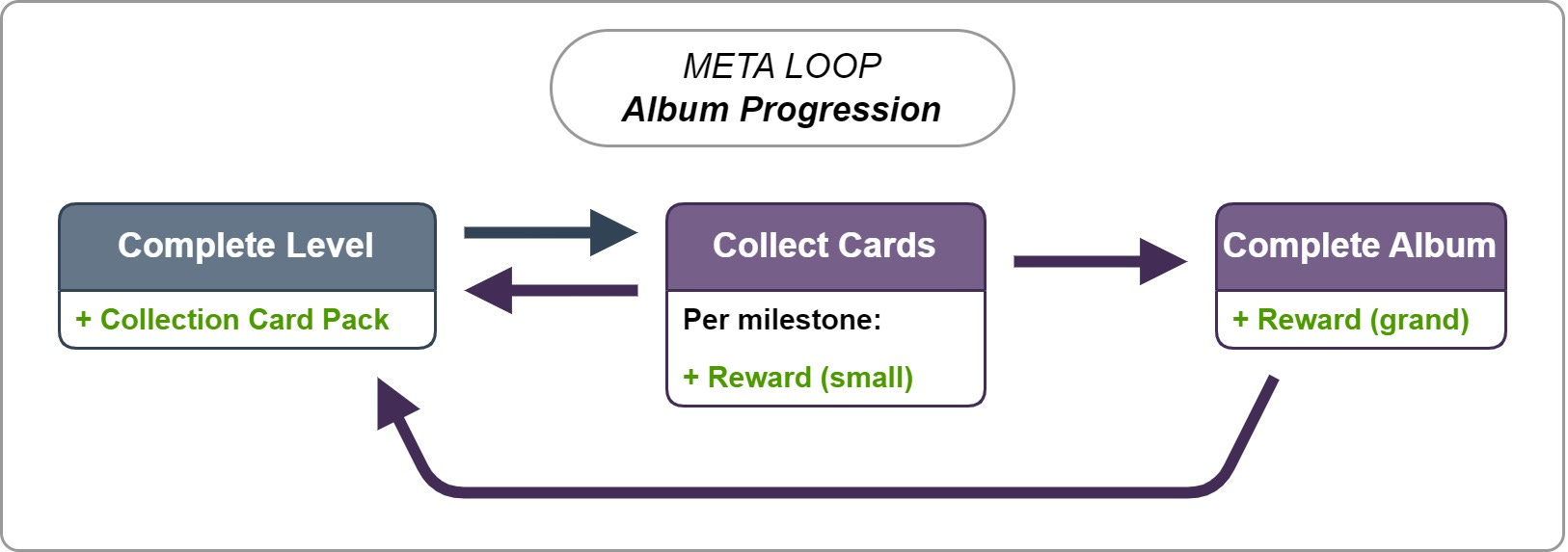 A collectible album mechanic drives long-term engagement thanks to the satisfaction of finding new items and achieving milestones. Collection card packs can be found in levels marked as including a pack. Additionally, other meta layers also provide some card packs as rewards. Each new album is unlocked at a certain level. Completing an album gives a grand reward, while reaching a milestone by collecting a specific number of cards provides a small coin reward. It becomes available from level 28.