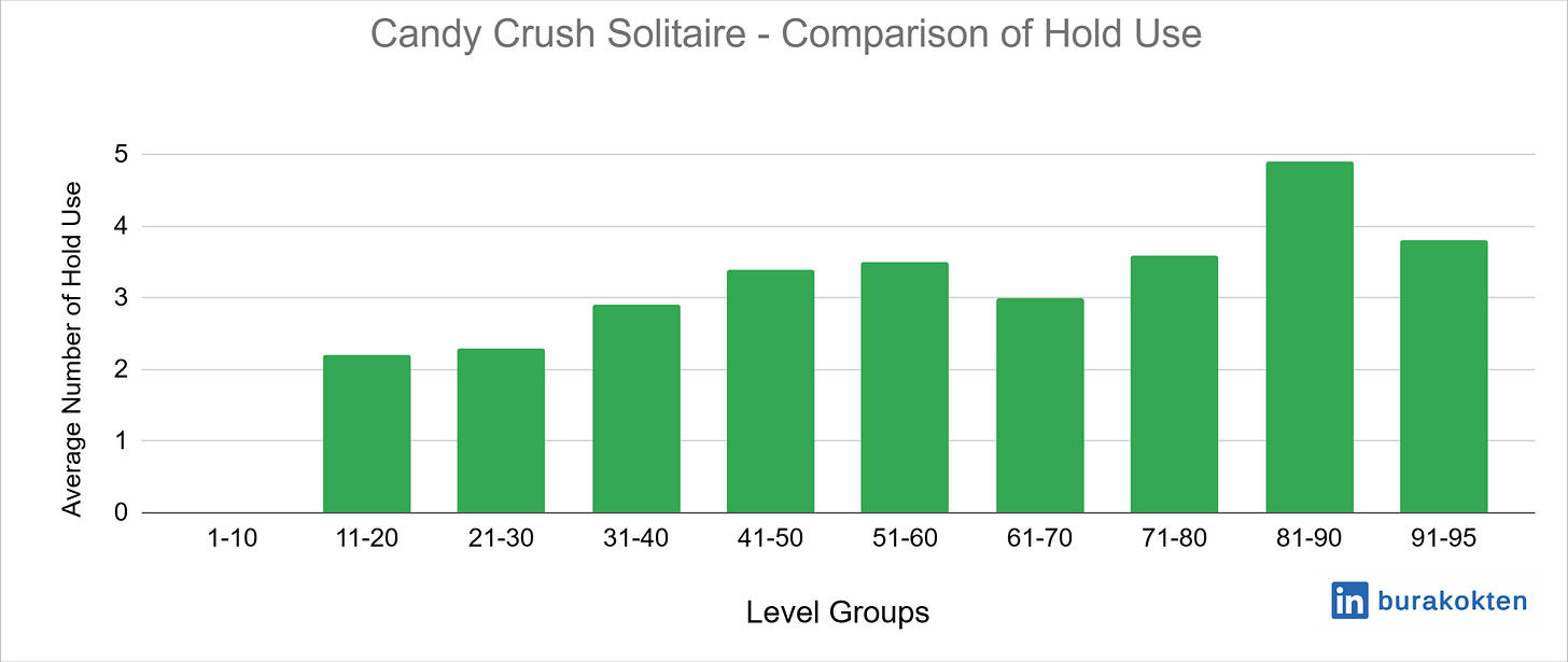 In this chart, calculated values represents the required amount of stockpile cards to complete the level without using any boosters. Calculated (Max) shows how many of them is needed if players doesn’t use the hold slot, and Calculated (Min) represents the minimum number required in best-case scenario when the hold slot is used. Drawn indicates how many cards are drawn from the stockpile to complete the levels. Initially Given is the number of stockpile cards given at the beginning of the level.