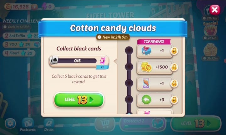 Cotton Candy Clouds is a time-limited, milestone-based event that resets progression and refreshes rewards after a certain period. I also encountered a name change from “Cotton Candy Clouds” to “Bubble Gum Parade”. Players are supposed to collect a card of a specific color (event currency) to reach each threshold. Each milestone completion rewards players with different prizes. It becomes available after level 12.