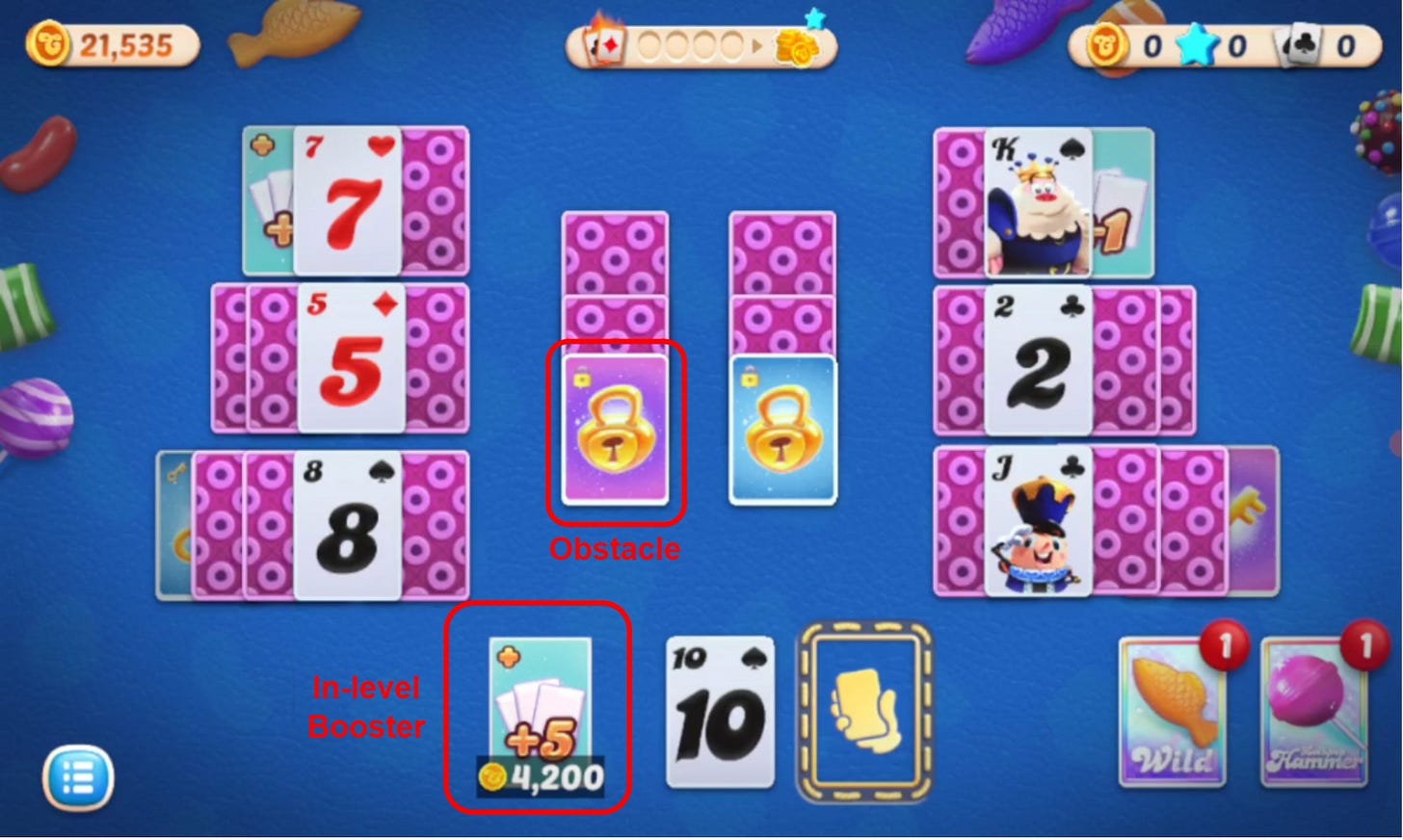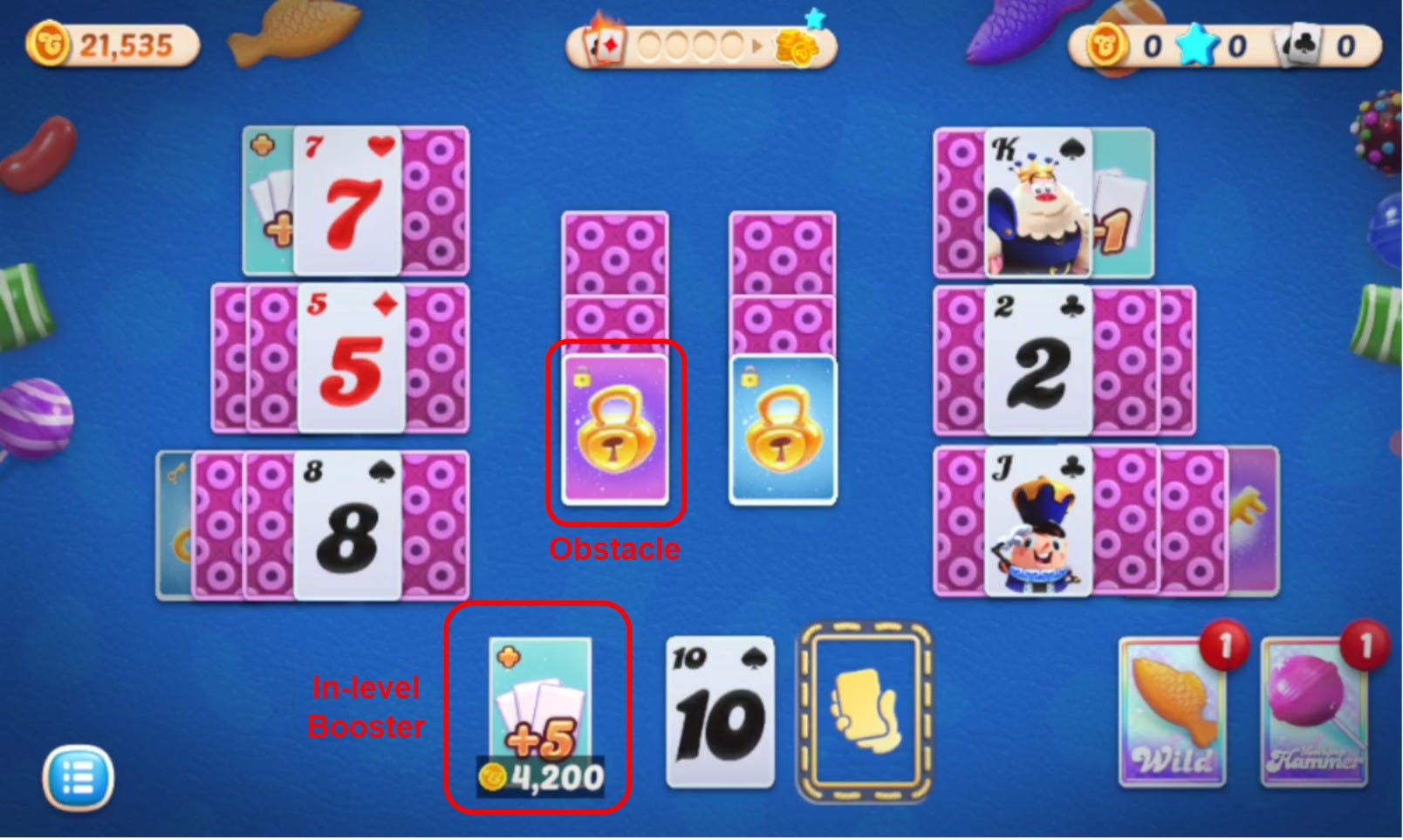 As is common in the tripeaks solitaire genre, streaks are also part of the levels, encouraging players to collect more cards consecutively by rewarding them. Although there are additional rules, such as collecting same color cards or collecting one red and one black card in a specific order, which double the rewards (coins, extra cards, and wild cards), simply collecting any numeric card without using the stockpile is also enough. After each successful streak, the next one begins with a higher requirement, which is expected to encourage players to use more boosters.