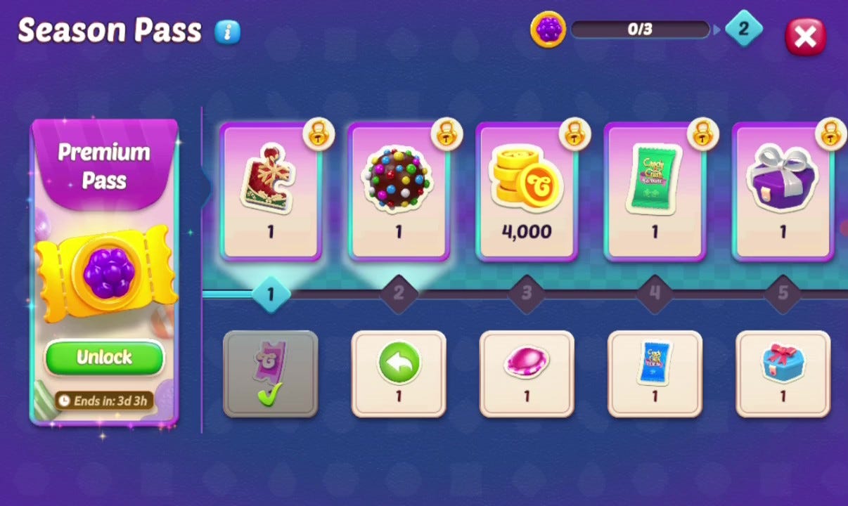 Season Pass becomes available after level 54. Level completions reward the player with candies, which are used to progress through it. There are both premium and free tiers, as shown in the image.