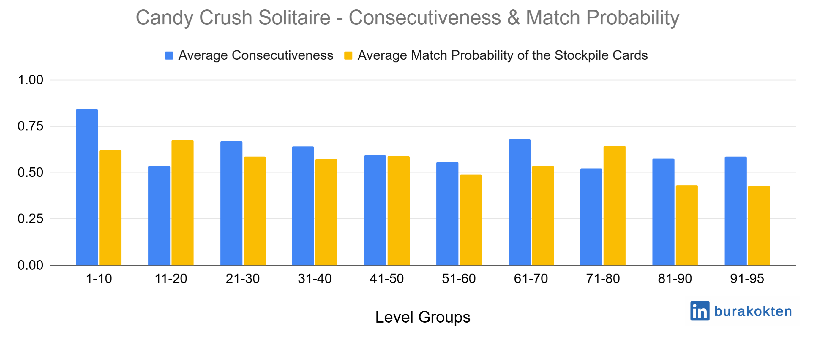Comparison of the average consecutiveness (max: 1, min 0) - A higher ratio means that more board cards can be collected consecutively before a new card is needed from the stockpile. 1 means that all board cards can be collected in a chain, while 0 means that each board card requires a new stockpile card.