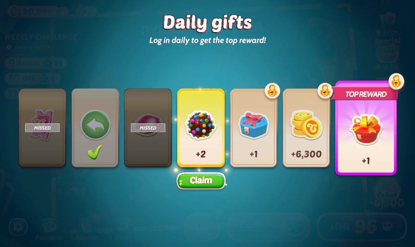 Daily Gifts mechanic becomes available after level 6. Player must log in the game everyday in order to collect the daily reward. If the player misses a day, the reward for that day cannot be obtained later. When the player reaches day 7, a top reward is granted.