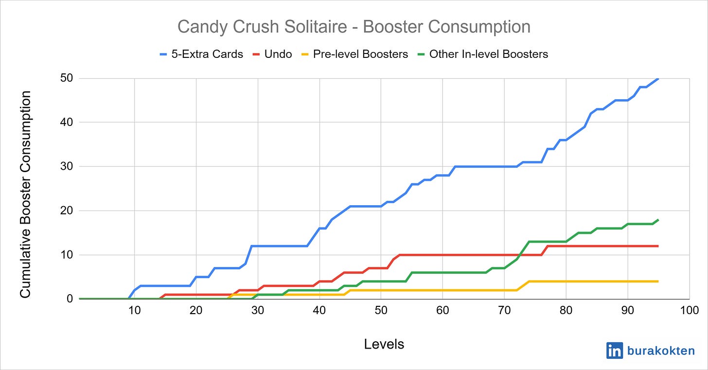 I tried to avoid using boosters as much as possible except for the 5-Extra Cards booster, as shown in the chart. I used 50 5-Extra Cards, 12 Undo, 4 pre-level and 18 Wild and Hammer boosters in total.