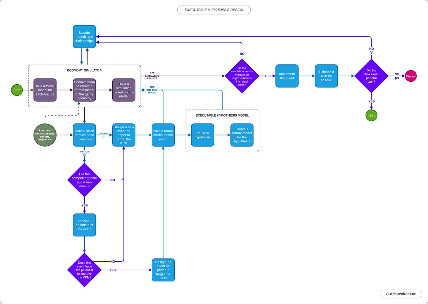 Executable hypothesis design is a mathematical hypothesis modeling method used to reason in advance about which behaviors game design decisions will produce. Its strongest aspect is that by running different behavior models together, it makes causal relationships visible that cannot be seen through intuition alone.