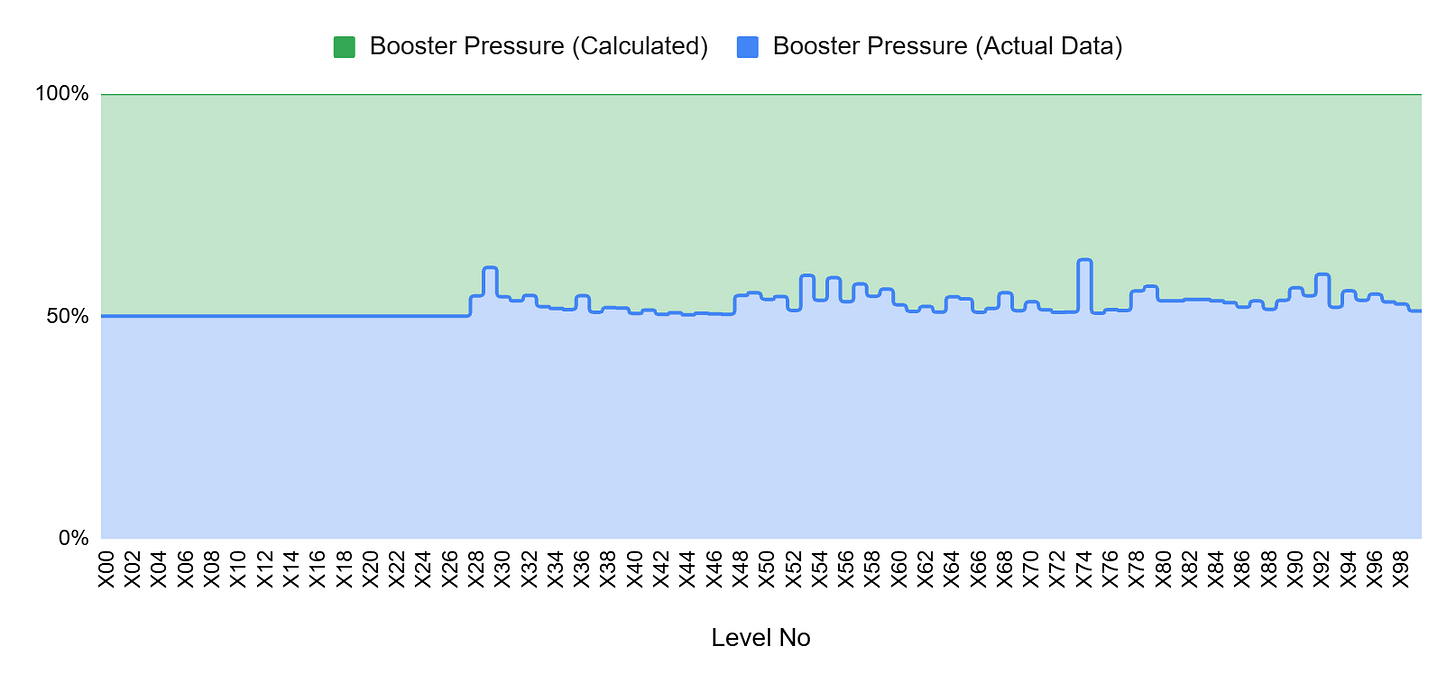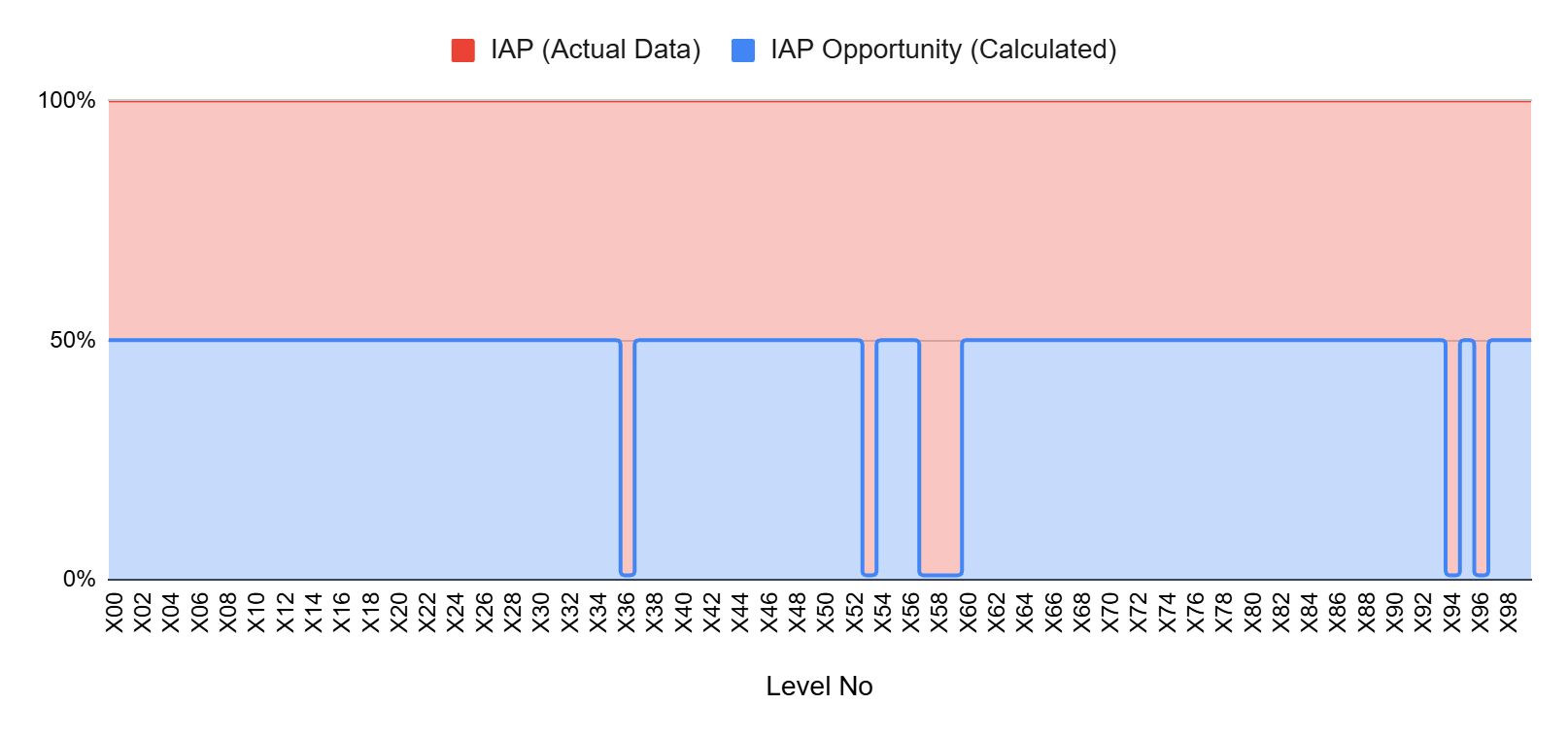 Moreover, actual IAP points decrease in the simulation because the new booster inputs reduce the system’s tendency to generate IAP behavior compared to the original state. As shown in the chart above, IAP opportunity shows a drop on the levels where IAPs were originally made. Previously generated IAPs now have the potential to be lost under the new system behavior.