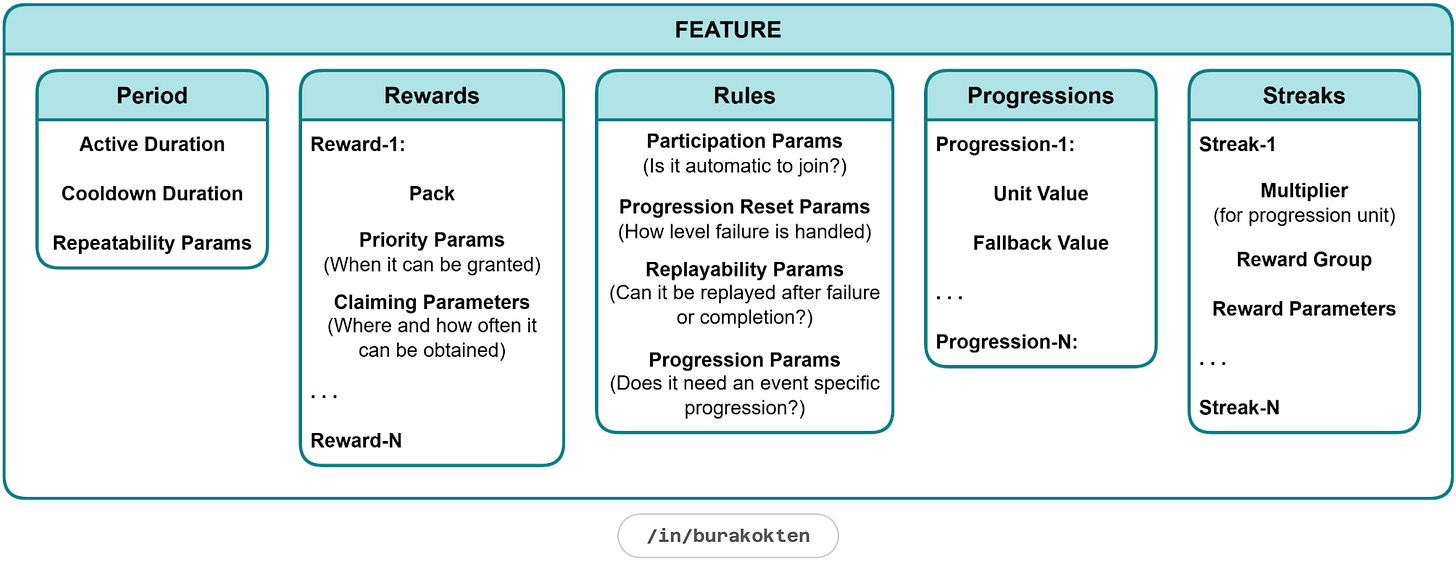 A feature is a dynamic module for liveops event design. Although many different sub-systems can be attached, I considered 5 main systems: