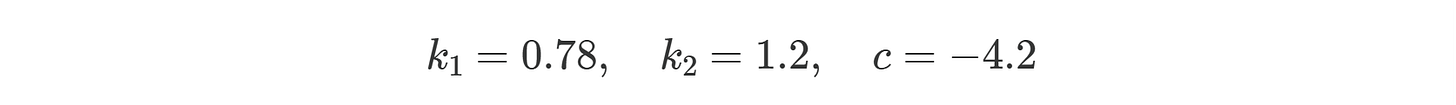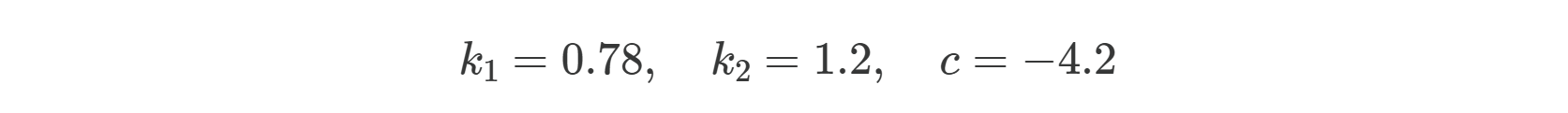 where f(b1, b2) represents the calculated churn value for given b1 and b2, with b1 representing booster consumption and b2 representing boosters at level start. k1, k2, and c are constants to be calibrated.