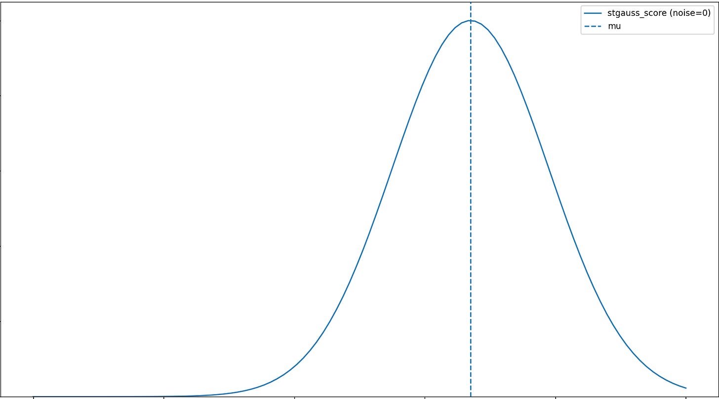 A bell‑shaped score centered at a target value that falls off with distance from the target and adds mild randomness.