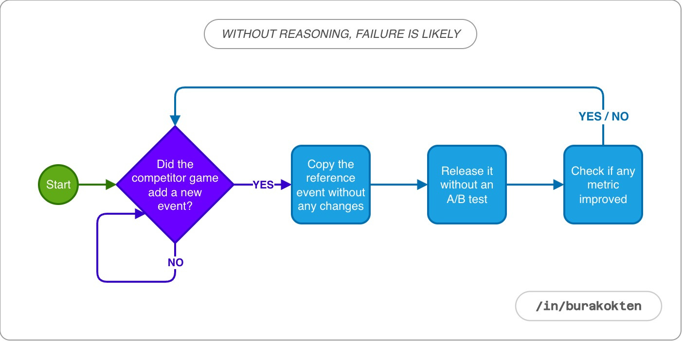 Let’s start with one of the most common mistakes made when developing a new event or feature. A competitor game, usually one that is already established in the market and generating revenue, releases a new event or makes a change in the game. Product teams notice the update and begin preparing to add it to their own game as quickly as possible.