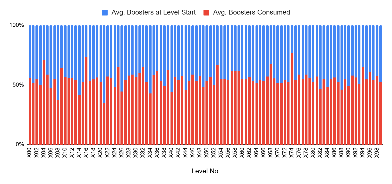 For this example, we will ignore several factors for the sake of simplicity, such as coin earnings, their exchange into boosters, and the impact of difficulty trends on player engagement. We will also assume that the average booster usage represents the number of boosters required for a player to complete a level. In reality, this value may also be influenced by the boosters used by players who churn. In that case, looking only at the average may not be an accurate approach.